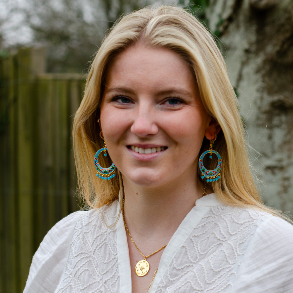 Add a pop of colour to any outfit with 'Turquoise' full moon Rajasthani earrings. Fun and stylish, made from hand-painted, lightweight brass with colourful beads. Perfect for any occasion!