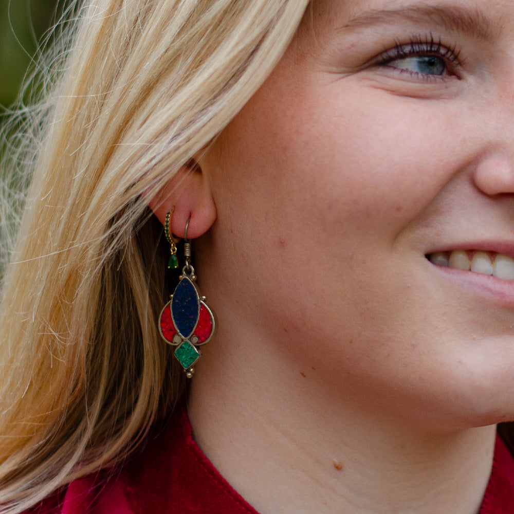 The 'boho' trend is back! So here is 'Harlequin' - hot from the Pink City's markets. Fun, pretty silver plated, metal earrings with accents of turquoise, coral and lapis.  Livens up any outfit!