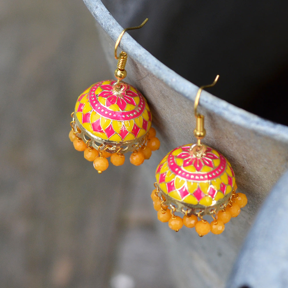 Add a pop of colour to any outfit with 'Honeydew' chandelier Rajasthani earrings. Fun and stylish, made from hand-painted, lightweight brass with colourful beads. Perfect for any occasion!