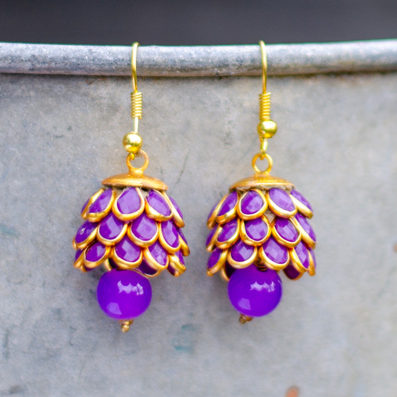 Add a pop of chic to any outfit with 'Fig' petal drop Rajasthani earrings. Fun and stylish, made from lightweight brass and glass beads. Perfect for any occasion!