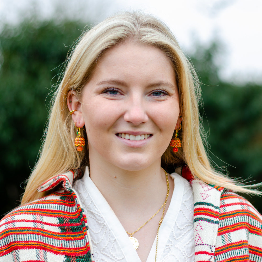 Add a pop of colour to any outfit with 'Tangerine' petal drop, Rajasthani earrings. Fun and stylish, made from lightweight brass and glass beads. Perfect for any occasion!