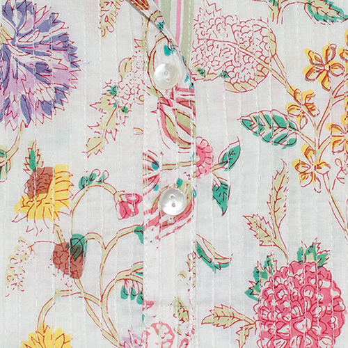Made from soft Indian cotton with a beautiful hand-block printed pattern, this top features intricate pintucking that adds body and structure, flattering all body types. With its nehru collar, length and mother-of-pearl buttons, this top radiates classic charm.