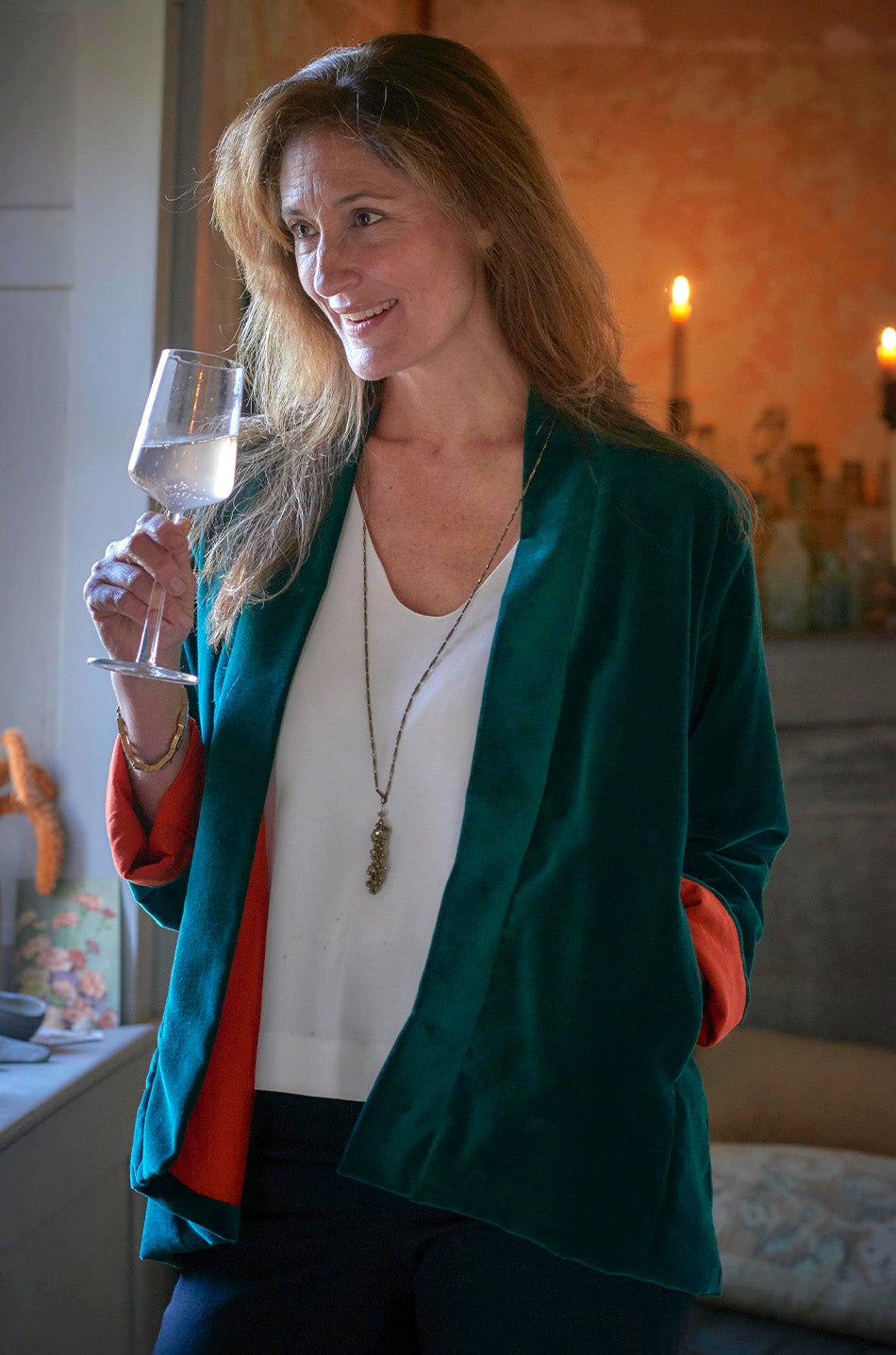 The ‘Basmati’ Bottle Green Cotton Velvet Jacket is an easy fitting, flattering design accented with vibrant pumpkin orange Cotton lining. This stylish take on the classic smoking jacket looks great with jeans during the day or paired with smart trousers for a chic evening look.