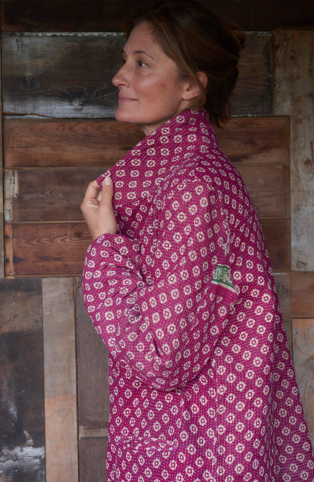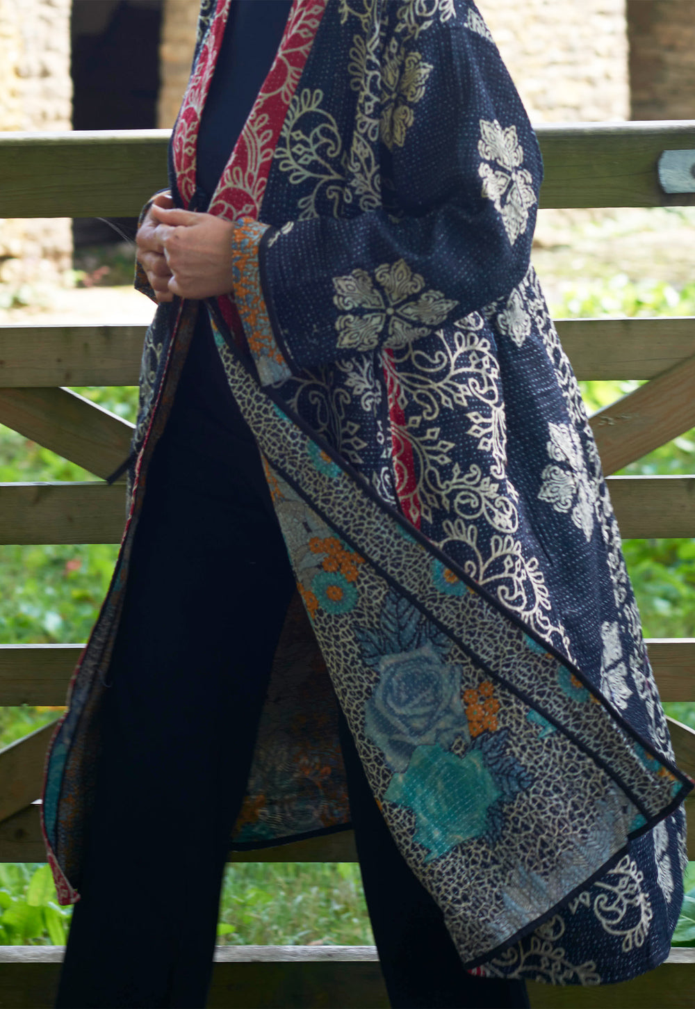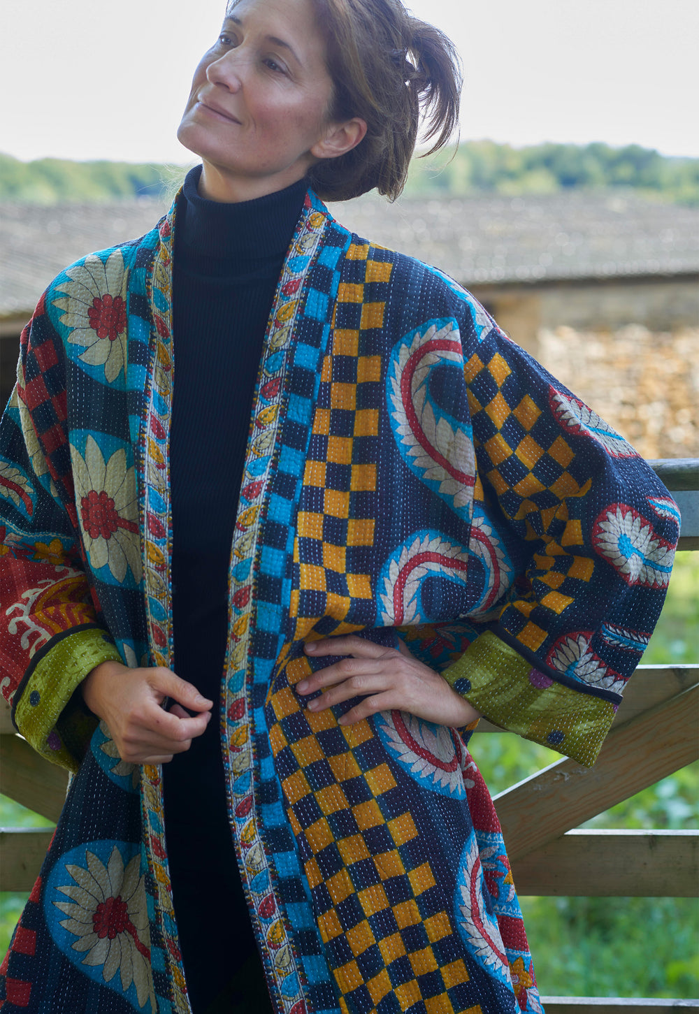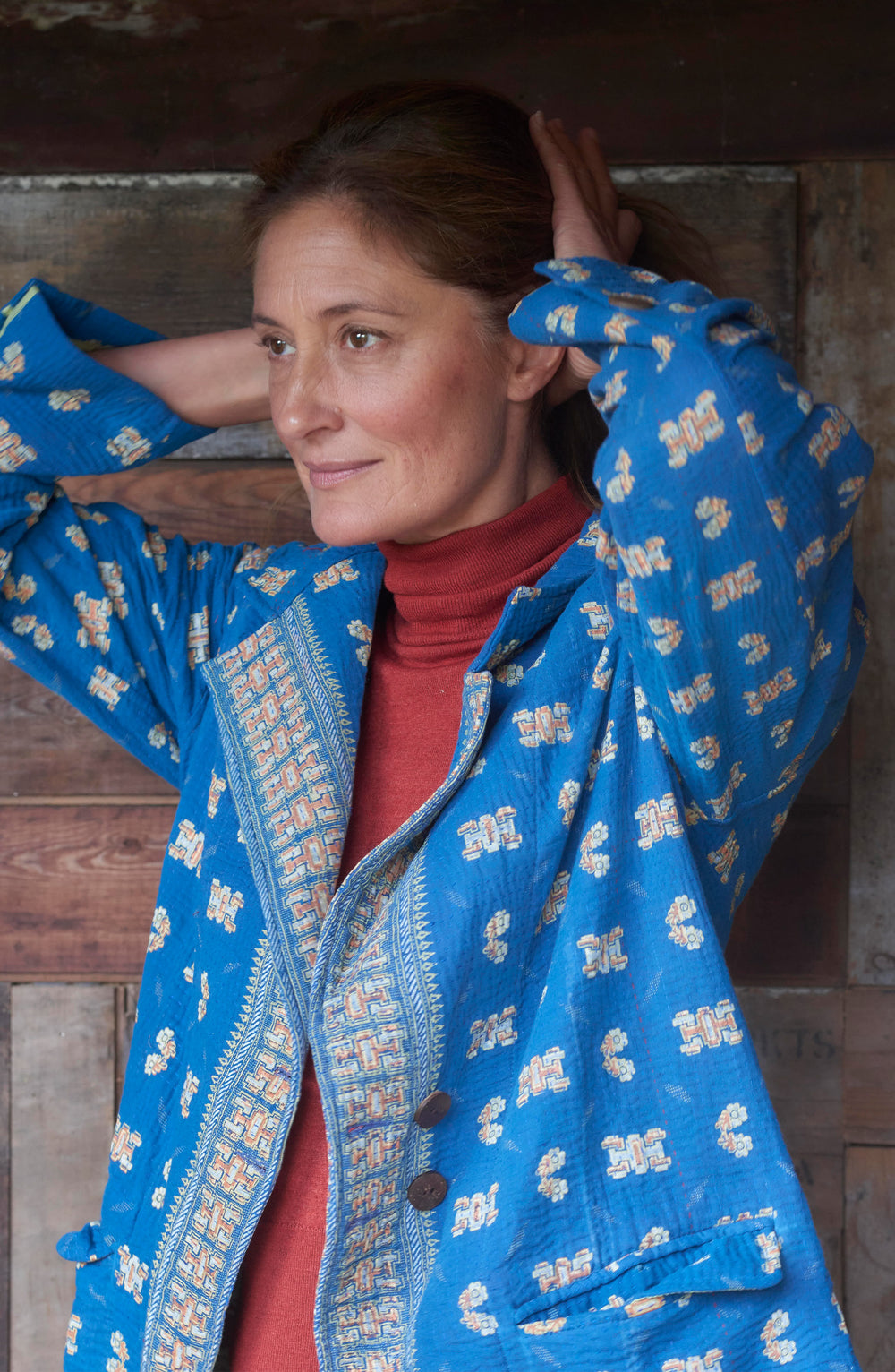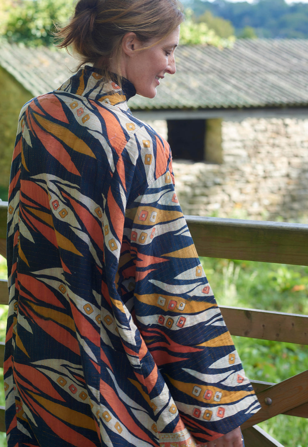 Our cotton Kantha jackets are unique pieces, each with its own story to tell. These jackets have been made from vintage cotton saris and are hand-stitched together using Kantha running stitch. We carefully choose the best of these pieces of fabric to translate into one of our versatile styles in wearable and original prints and colours.
