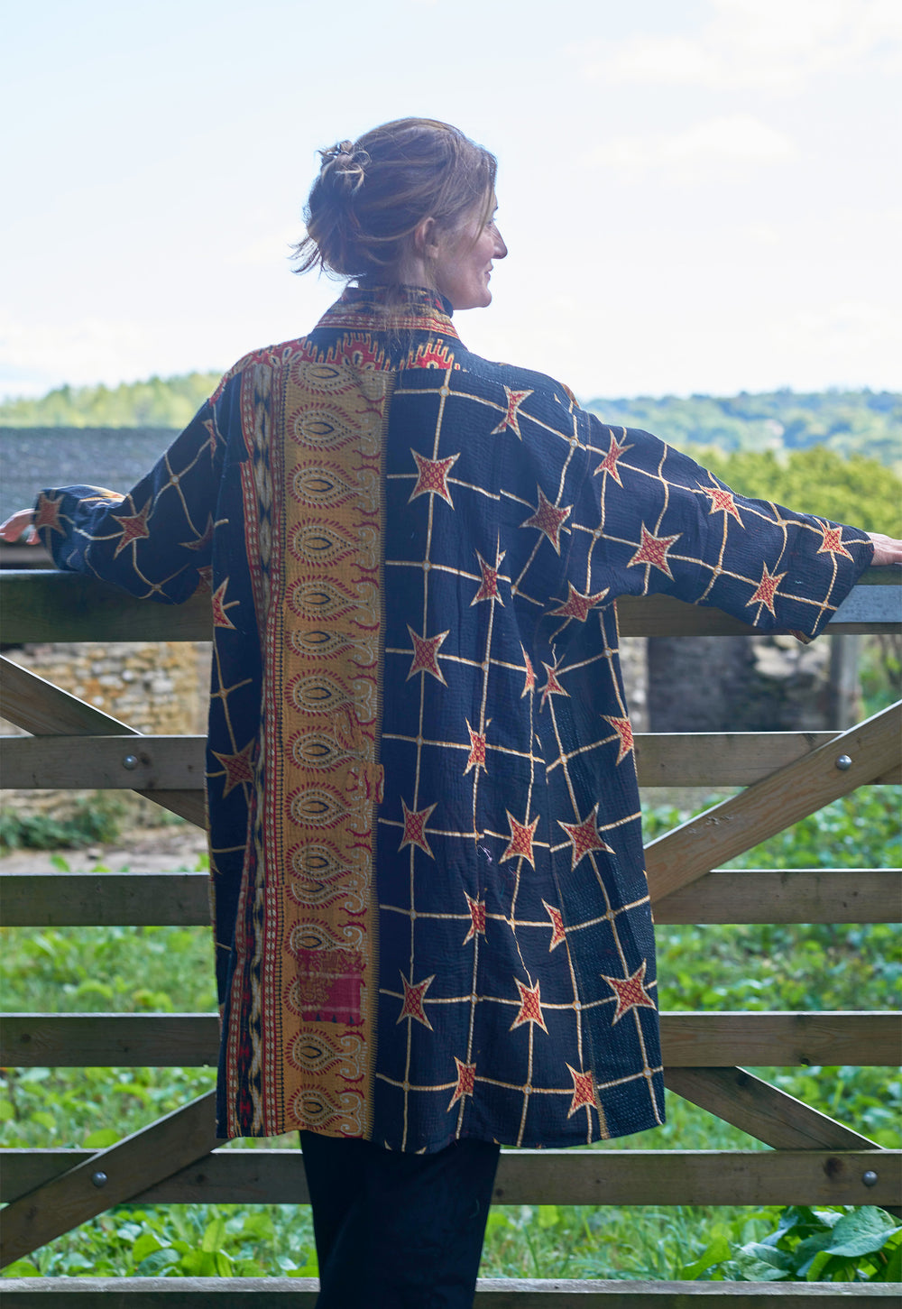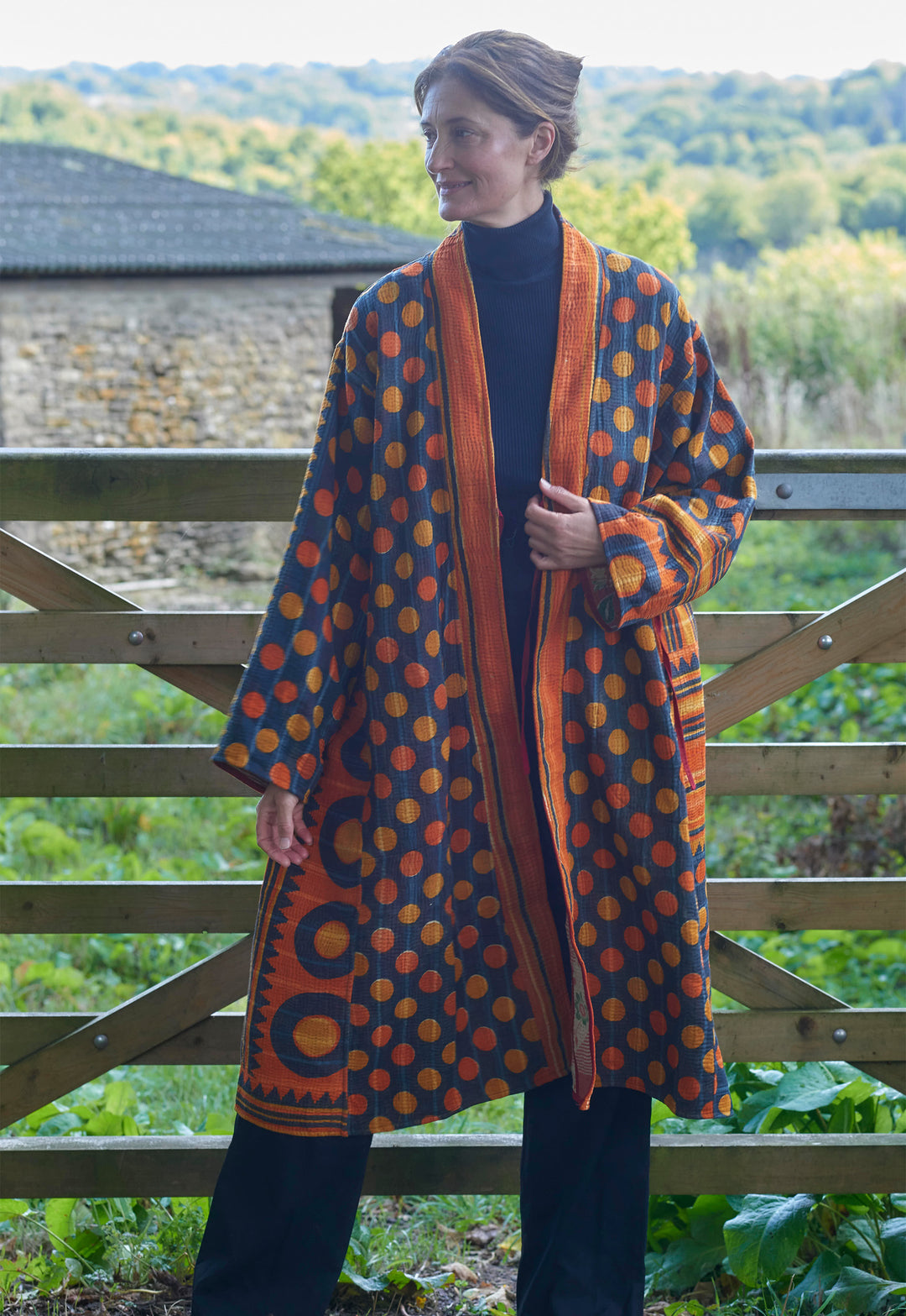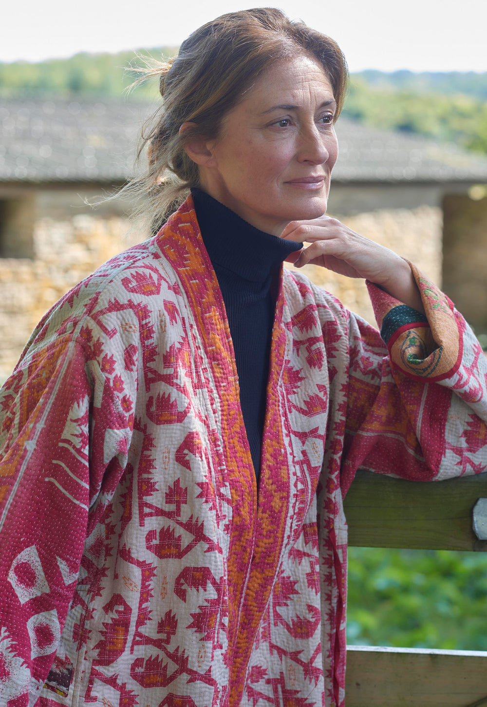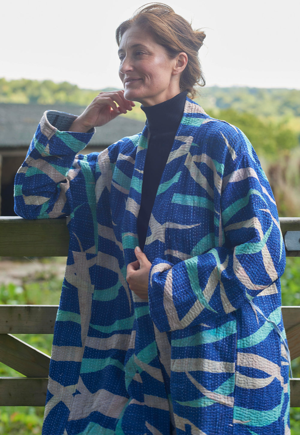 Our cotton Kantha jackets are unique pieces, each with its own story to tell. These jackets have been made from vintage cotton saris and are hand-stitched together using Kantha running stitch. We carefully choose the best of these pieces of fabric to translate into one of our versatile styles in wearable and original prints and colours.