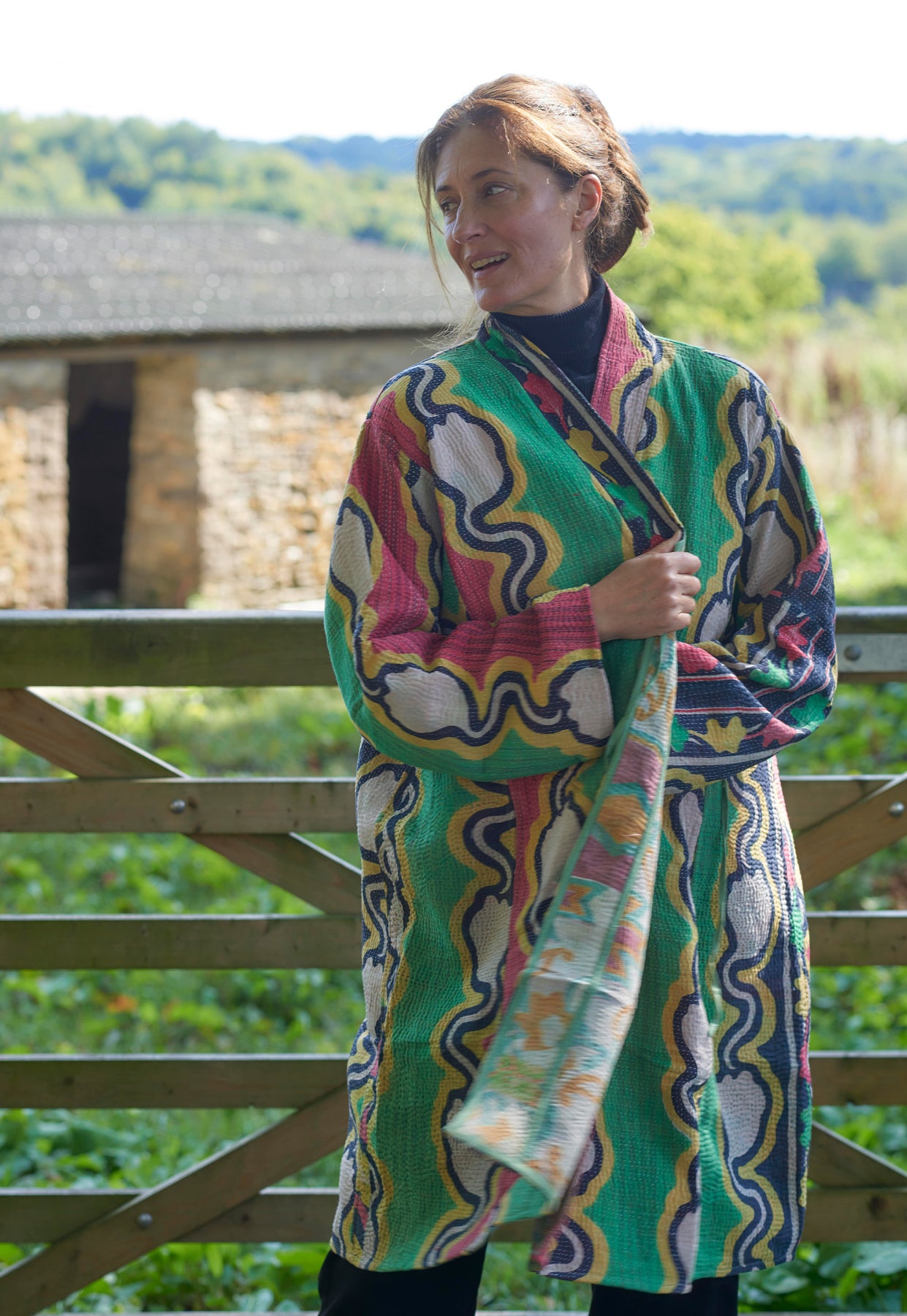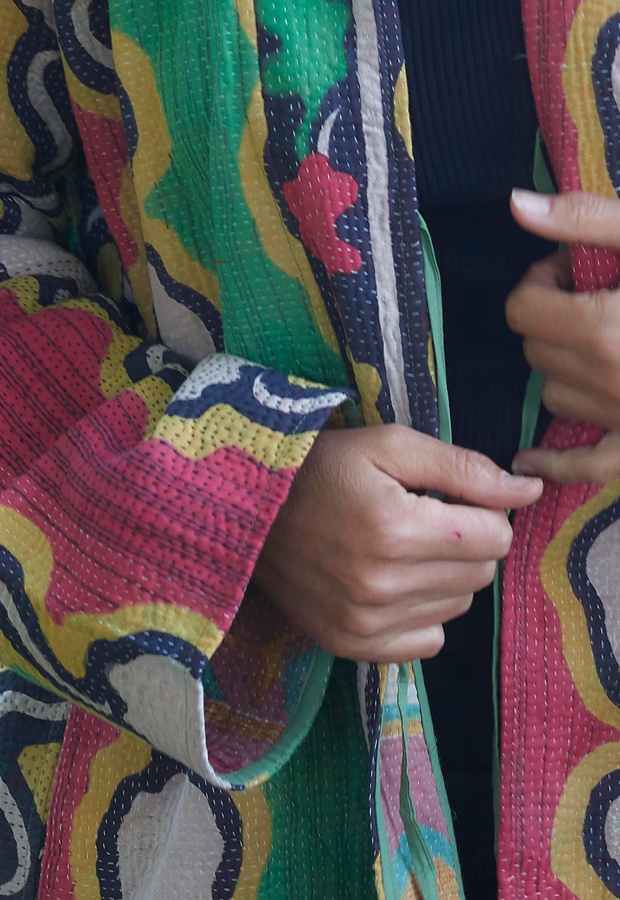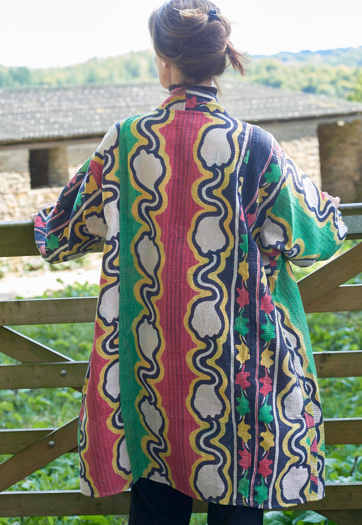 The Federica Cotton Kantha kimono-style Jacket is a very elegant easy fitting jacket, great for taller and fuller figures. Made from recycled vintage cotton saris and intricately hand-stitched using the Kantha stitch. It hangs edge-to-edge and includes all-important pockets. Each one is unique!