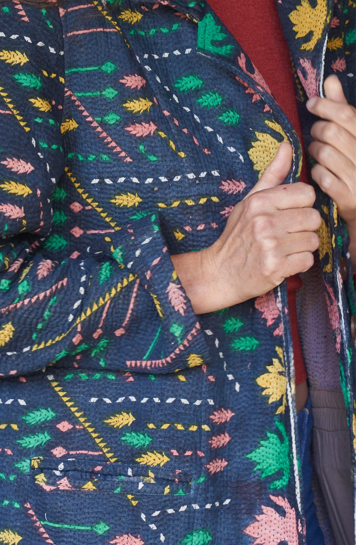 What makes these Jackets truly special is the story woven into their fabric: each one is made in India from recycled vintage cotton saris, stitched together by hand with Kantha embroidery. This centuries-old technique not only celebrates skilled craftsmanship but also breathes new life into beautiful textiles, ensuring that no two jackets are ever the same.