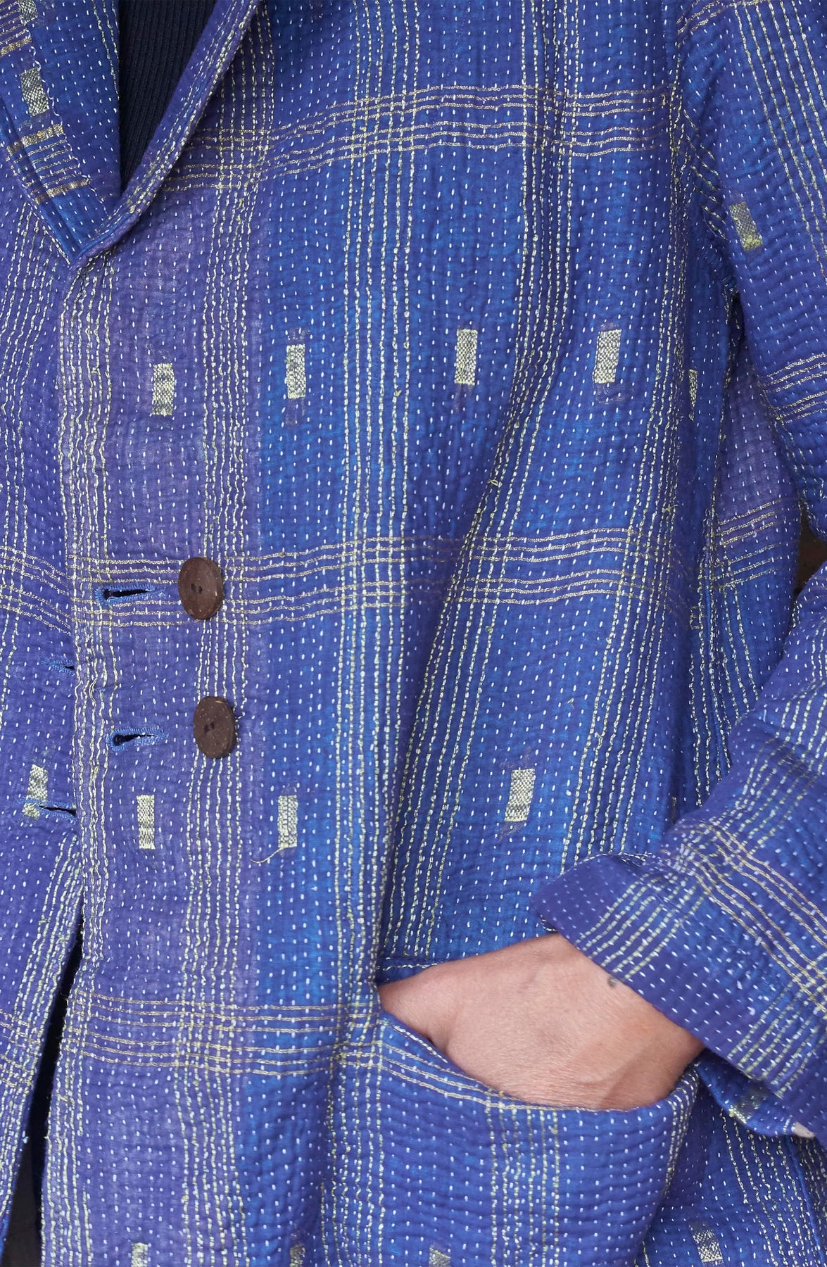 What makes these Jackets truly special is the story woven into their fabric: each one is made in India from recycled vintage cotton saris, stitched together by hand with Kantha embroidery. This centuries-old technique not only celebrates skilled craftsmanship but also breathes new life into beautiful textiles, ensuring that no two jackets are ever the same.