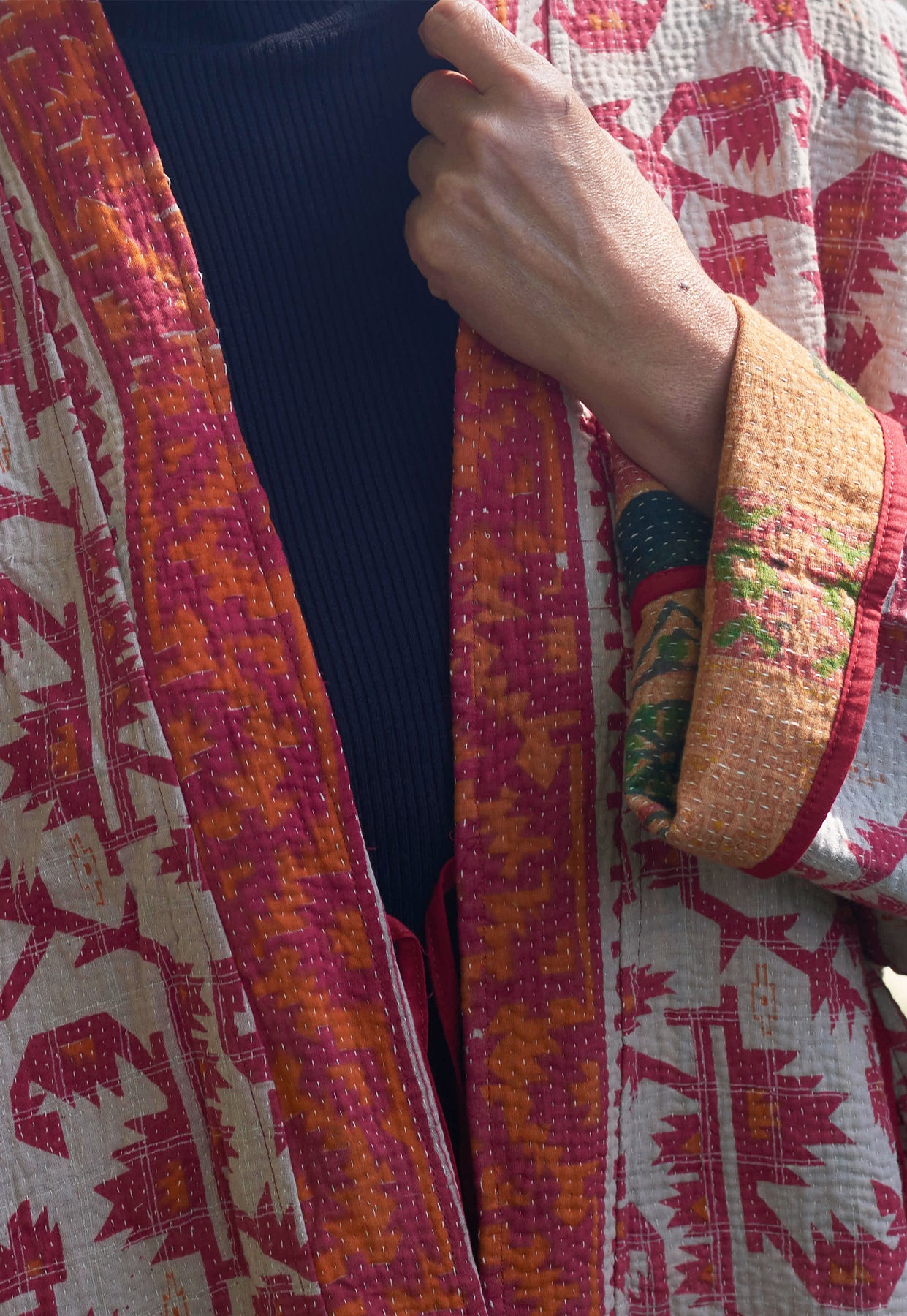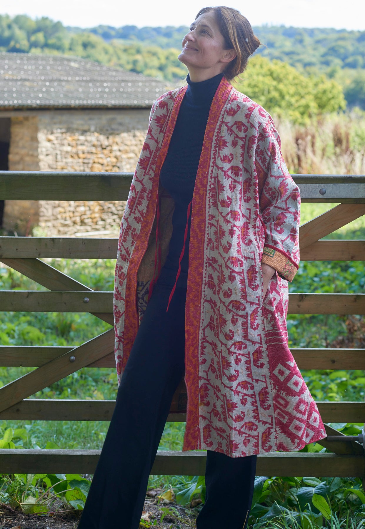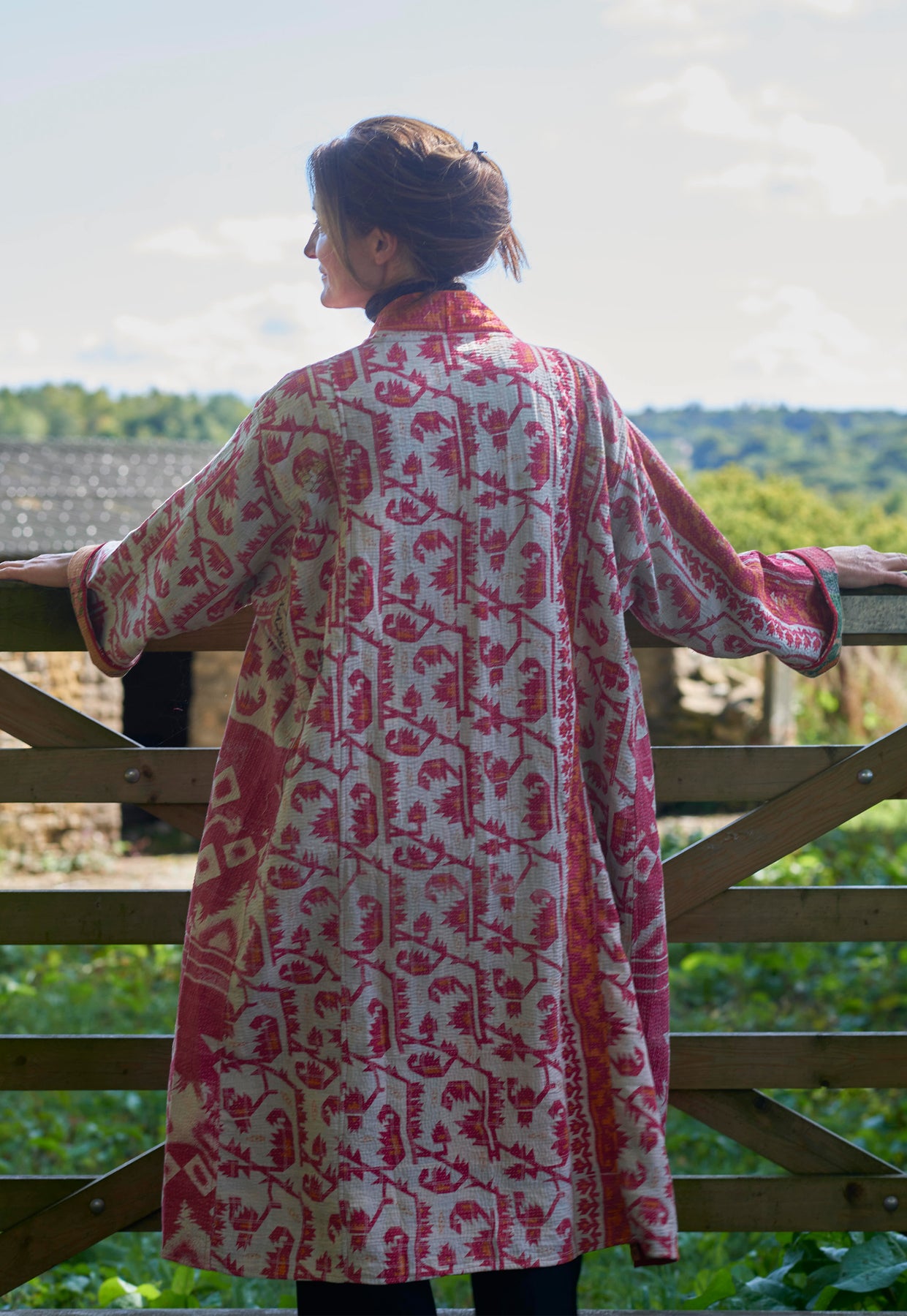 The Paola Cotton Kantha kimono-style Jacket is a very elegant easy fitting jacket, great for taller and fuller figures. Made from recycled vintage cotton saris and intricately hand-stitched using the Kantha stitch. It hangs edge-to-edge and includes all-important pockets. Each one is unique!