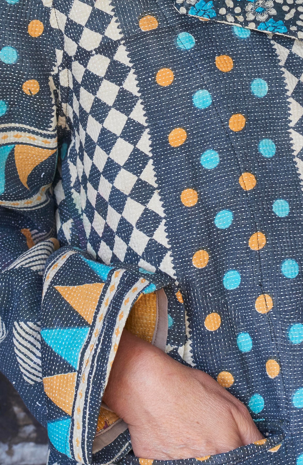 What makes these Jackets truly special is the story woven into their fabric: each one is made in India from recycled vintage cotton saris, stitched together by hand with Kantha embroidery. This centuries-old technique not only celebrates skilled craftsmanship but also breathes new life into beautiful textiles, ensuring that no two jackets are ever the same.