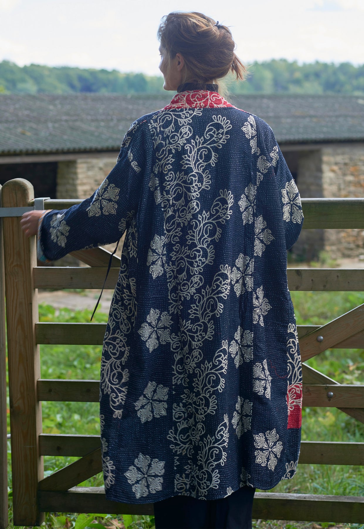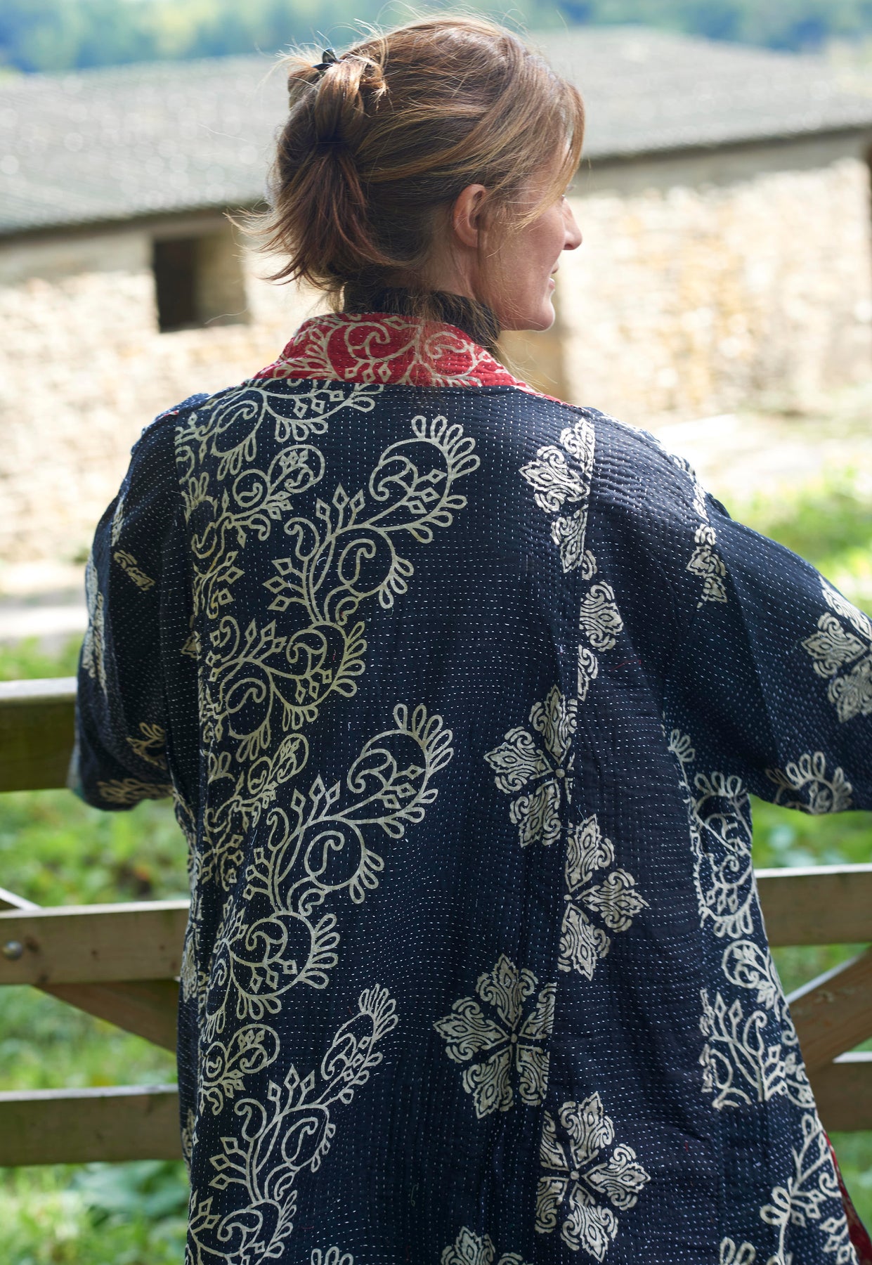 The Valentina Cotton Kantha kimono-style Jacket is a very elegant easy fitting jacket, great for taller and fuller figures. Made from recycled vintage cotton saris and intricately hand-stitched using the Kantha stitch. It hangs edge-to-edge and includes all-important pockets. Each one is unique!