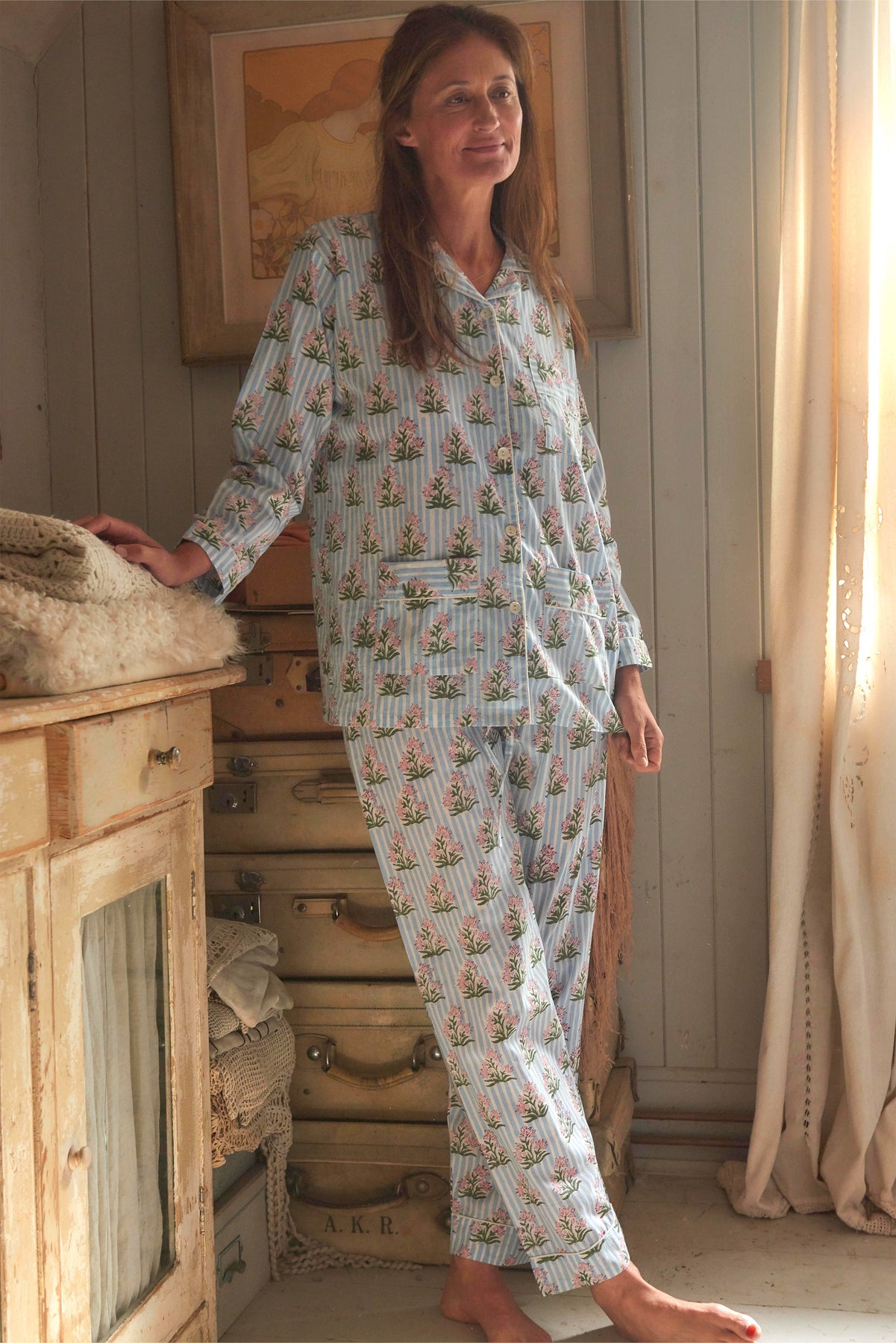 Made from fine, soft & lightweight hand block-printed Cotton, detailed with fine piping detail and mother-of-pearl buttons. The trousers have an elasticated waist and tie for extra comfort, and the pyjama top has deep patch pockets and breast pocket and each pair come in their own matching cotton pochette.