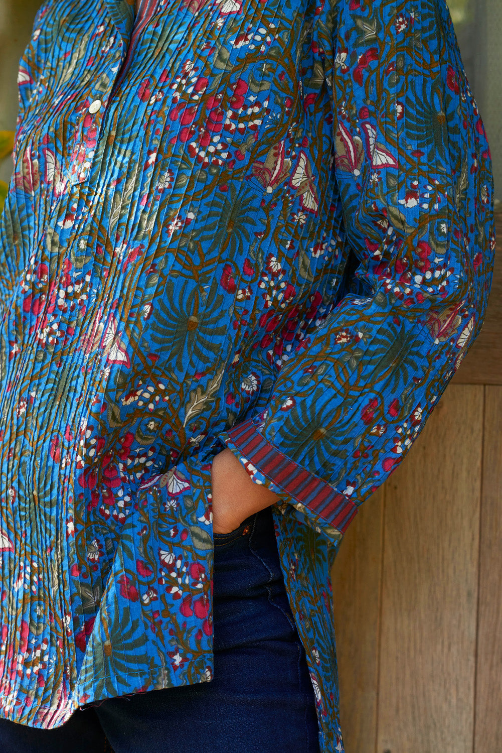 Made from soft Indian cotton with a beautiful hand-block printed pattern, this top features intricate pintucking that adds body and structure, flattering all body types. With its nehru collar, length and mother-of-pearl buttons, this top radiates classic charm.