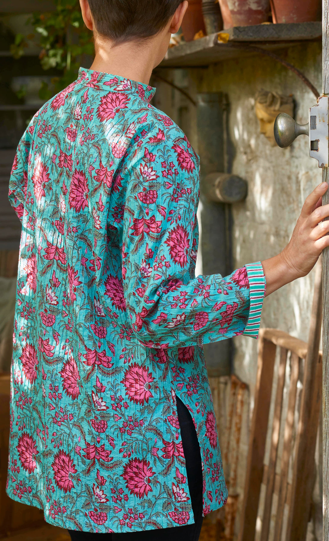 Made from soft Indian cotton with a beautiful hand-block printed pattern, this top features intricate pintucking that adds body and structure, flattering all body types. With its nehru collar, length and mother-of-pearl buttons, this top radiates classic charm.