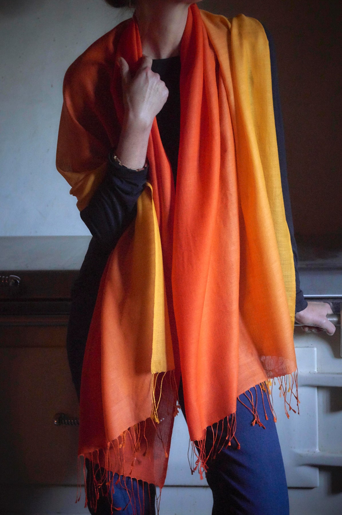 Wrap yourself in understated elegance with this one-off fine silk & wool ombré scarf. A thoughtful addition to any outfit. Made from a high-quality silk and wool mix, it’s soft and light to wear, yet still offers gentle warmth. The subtle ombré fade from orange to yellow creates a beautiful shift of colour, giving a modern edge to classic styling.
