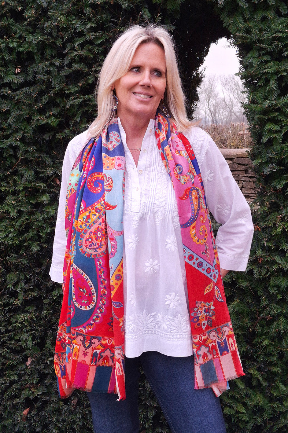 Instant effortless chic for Spring/Summer with the versatile and absolutely beautiful Pure Silk 'Fiesta' Scarf. A vibrant, colourful print, guaranteed to brighten up any outfit!