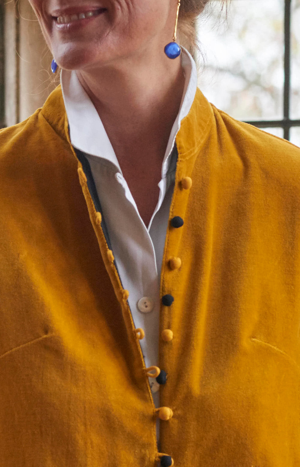 The ’Sharwani’ Plain Cotton Velvet Jacket is a sleek and soft style that feels great to wear. Made from a rich golden mustard Cotton Velvet with a simple black Cotton lining, it’s designed with two front pockets for convenience and fun alternate-coloured buttons for a bit of flair.