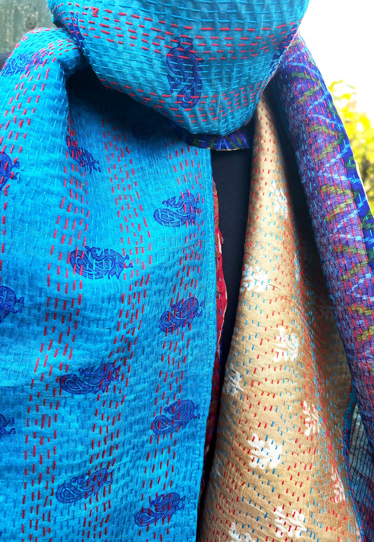 This luxurious, pure Silk Stole is made from two contrasting vintage silk saris, hand-sewn together with 'Kantha' running stitch. A one-off!